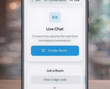 Pair two devices using a QR code or room code for real-time translated messaging across languages.