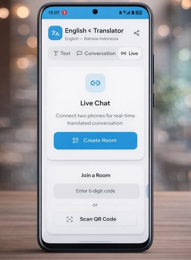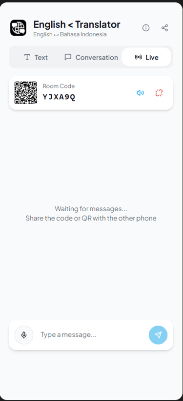 Translate text and voice from Bahasa to English to Bahasa. Have a conversation with your Indonesian of English speaking friend OR created a Live Chat Room connect via Room Code or QR Code.